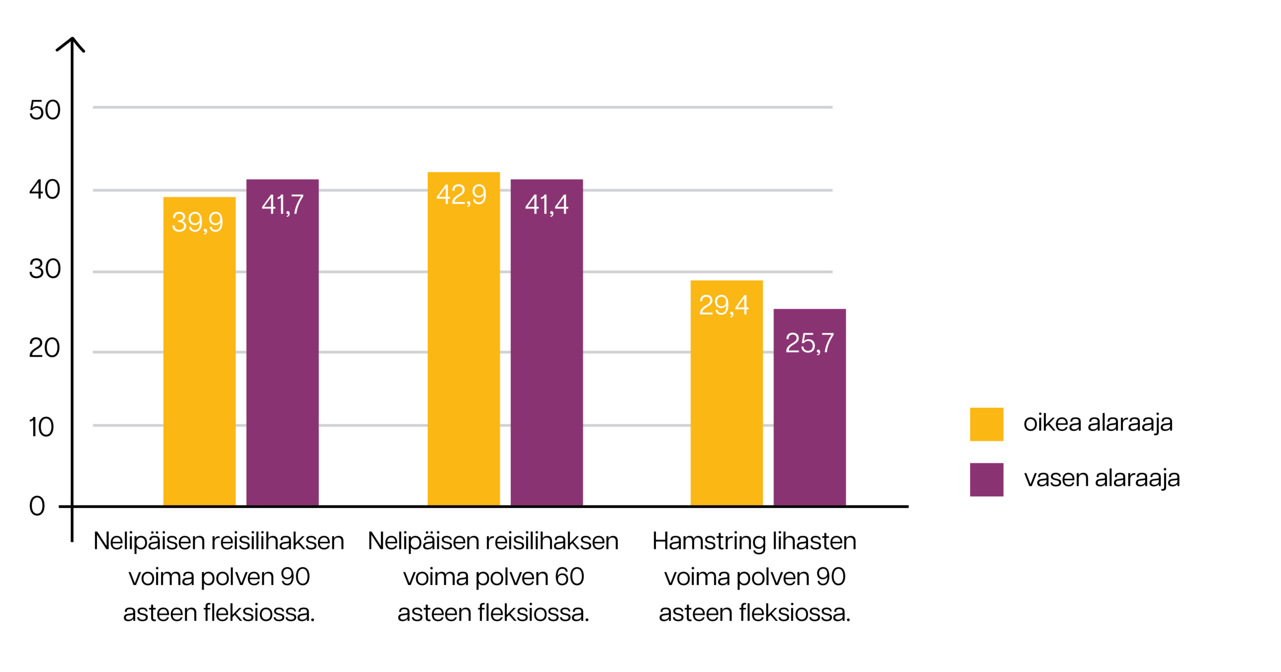 – vasemman ja oikean nelipäisen reisilihaksen voimakkuuden suhde 60 asteen taivutusasteessa oli 97%,