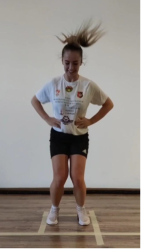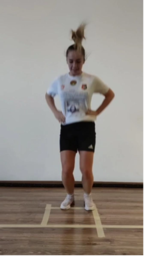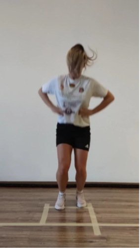 Lähtöasento: Potilas seisoo yhdellä jalalla hieman taivutettuna lonkka- ja polvinivelissä, kädet lantiolla.