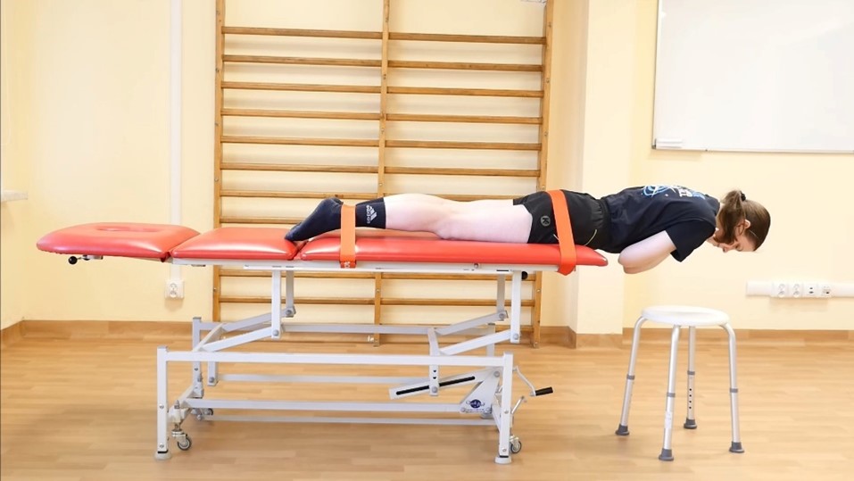 - Trunk Extensor -kestävyystestissä arvioidaan vartalon ojentamisesta vastaavien lihasten kestävyyttä, mukaan lukien pystyssä olevat spinae-, latissimus dorsi-, iliocostalis ja multifidus-lihakset. Se on ajoitettu, isometrinen testi, johon liittyy näiden ojentajalihasten staattinen supistuminen, jotka vakauttavat selkärangan. Testi suoritetaan siten, että osallistuja makaa kuvapuoli alaspäin, lantio ja ylävartalo ulottuvat pöydän reunan yli, kun taas alaraajat ovat vakautettuja. (kuva 3)